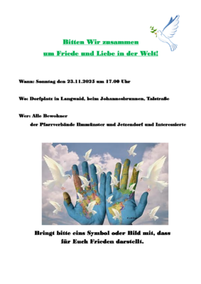 Am 23.11.2025 findet um 17 Uhr am Dorfplatz in Langwaid, beim Johannesbrunnen in der Talstraße ein gemeinsames Friedensgebet der beiden Pfarrverbände Ilmmünster und Jetzendorf statt. Bitte ein Symbol oder Bild mitbringen, dass für euch den Frieden darstellt.